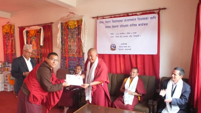 वार्षिक प्रशिक्षण तालिम कार्यक्रम अनुसार गोन्पा विद्यालयमा अध्यापनरत शिक्षकहरुलाई यस वर्ष पनि शैक्षिक तालिम केन्द्र, त्रिपुरेश्वर, काठमाण्डौंले नेपाल बौद्ध महासंघको समिक्ष हाल तीनचुलीमा गत कार्तिक–३ देखि १२ गतेसम्म शिक्षकको पेसागत विकास (टि.पि.डी.) तालिम ढाँचामा सञ्चालन भएको दश दिने गोन्पा/विहार शिक्षा शिक्षक प्रशिक्षण तालिम प्रदान गरिएको छ । दश दिनको प्रशिक्षण कार्यक्रममा शिक्षकहरुलाई विद्यालयमा कक्षाकोठा व्यवस्थापन, विद्यालय सुधार योजन, शिक्षण विधिको परिचय र क्रियाकलाप निर्माण विधि, शैक्षणिक सामग्री निर्माण र त्यसको प्रयोग आदि विषयमा प्रशिक्षण दिएको थियो ।
