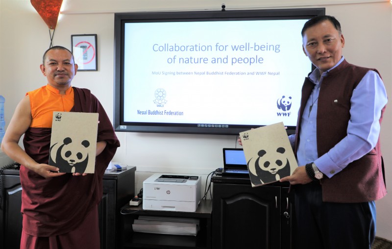 Nepal Buddhist Federation and WWF Nepal entered a five-year partnership through the signing of a Memorandum of Understanding (MOU) at the WWF Nepal premise today. This partnership aims to forge strong collaboration and materialize on common conservation values to address pressing contemporary environmental issues, blending scared philosophies, faith values, and traditional knowledge with modern conservation science for the wellbeing of people and nature.