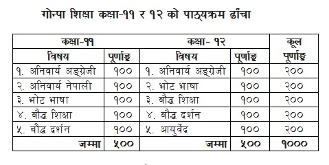 बैठकको निर्णय अनुसार कक्षा–११ मा अनिवार्य अङ्ग्रेजी, अनिवार्य नेपाली, भोट भाषा, बौद्ध शिक्षा, बौद्ध दर्शन गरी पाँच विषय ५०० पूर्णाङ्क र कक्षा–१२ मा अनिवार्य अङ्ग्रेजी, भोट भाषा, बौद्ध शिक्षा, बौद्ध दर्शन, आयुर्वेद पाँच विषय ५०० पूर्णाङ्क गरी जम्मा १००० पूर्णाङ्कको गोन्पा शिक्षा उच्च माध्यमिक तहको पाठ्यक्रम निर्माण हुने भएको छ ।
